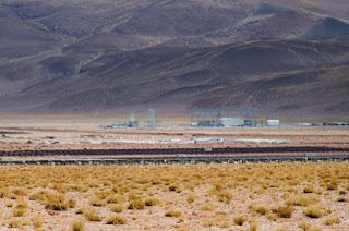 Al fondo, el gigantesco Parque Solar de Cauchari y en primer plano las tolas, arbustos típicos de la Puna, que resisten la escasez de agua y de oxígeno propios de la región. La mayor planta de su tipo en operación en América del Sur queda en medio de la nada, a unos kilómetros de la comunidad kolla de Puesto Sey, en cuyo territorio hay ahora 962 496 paneles fotovoltaicos.