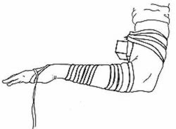 Enrolle su manga de modo que el tefilín esté en contacto directo con el brazo. Pase el brazo a través del círculo formado por la correa. Coloque la cajita encima del bíceps, justo por debajo del punto intermedio entre el hombro y el codo al frente del corazón. (Véase la ilustración).