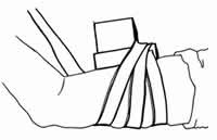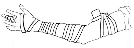 Envuelva dos veces más sobre el costado debajo de la caja y alrededor del bíceps, luego dé siete vueltas alrededor del brazo y una vuelta alrededor de la palma. Deje el resto de la correa suelto.