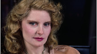 Imagina a una mujer atractiva, rubia, con los ojos azules y los labios pintados de rojo frente a una máquina de escribir.