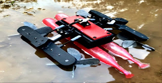 Las hélices actúan como ruedas sobre el suelo y como aletas para impulsar al robot sobre el agua. Logra nadar y correr sobre el agua a altas velocidades de 1,5 m / s.