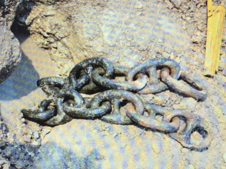 De las cadenas halladas por Jorge López, se cortó una pequeña sección para analizarla en el laboratorio. Es de hierro con escoria, y cada eslabón posee un contrete, esto es, una pieza que evita que el eslabón se aplaste. Todo indica que son de esa época.