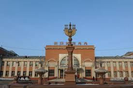 Estación de trenes de Birobidzhan, con una menorá al frente