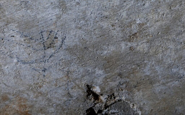 Primer plano de la menorá de la era del Segundo Templo dibujada en una cisterna en los acantilados de al-Aliliyat cerca de la moderna Kfar Mukhmas.