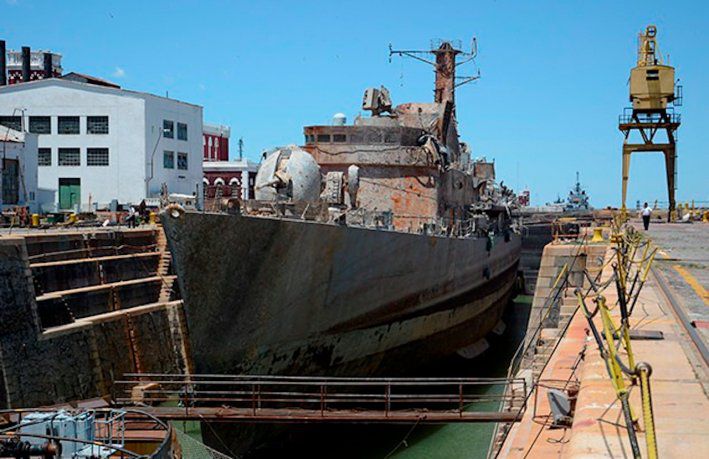 Se trata del ex-Destructor A.R.A. Santísima Trinidad, que estuvo casi tres años semihundido en la dársena de la Base Naval de Puerto Belgrano por la rotura de una válvula.