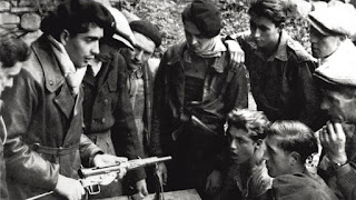 Un oficial de la resistencia francesa enseña a su compañeros cómo usar un subfusil en marzo de 1944.