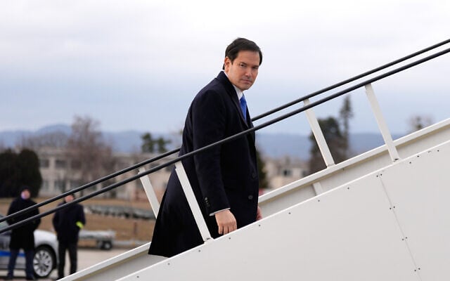 Marco Rubio embarca en el avión al salir del aeropuerto de Bratislava en Bratislava, Eslovaquia, el 15 de febrero de 2026. (AP/Alex Brandon, Billar)