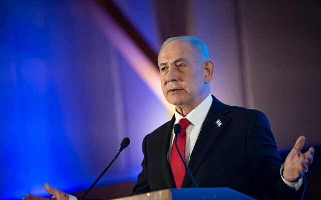 El primer ministro Benjamin Netanyahu asiste a la Misión de Liderazgo de la Conferencia de Presidentes en Israel en Jerusalén, 15 de febrero de 2026 (Chaim Goldberg/Flash90)