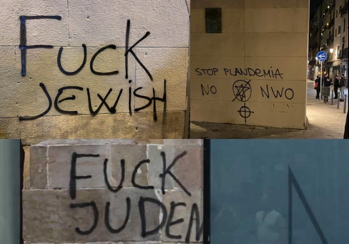 Luego de los graves tras una protesta contra los confinamientos en Barcelona, aparecieron pintadas antisemitas en la Via Laietana, cerca del casco antiguo, que alberga centros y comercios gestionados por miembros de la comunidad judía de esta ciudad.